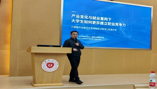 为深化产教融合、搭建校企协同育人桥梁,3月11日,大健康产业数字化营销精英训练营宣讲会在经管文楼111报告厅举行。我校98级校友会秘书长唐雯、药创优盟总经理包宏伟、资深电商负责人刘将,以及国际医药商学院茅宁莹副院长、赵瑾副书记、实验教学中心主任吴方、工商管理专业负责人刘佳源、项目负责人刘丽莉、辅导员赵侃及学生代表参加活动。